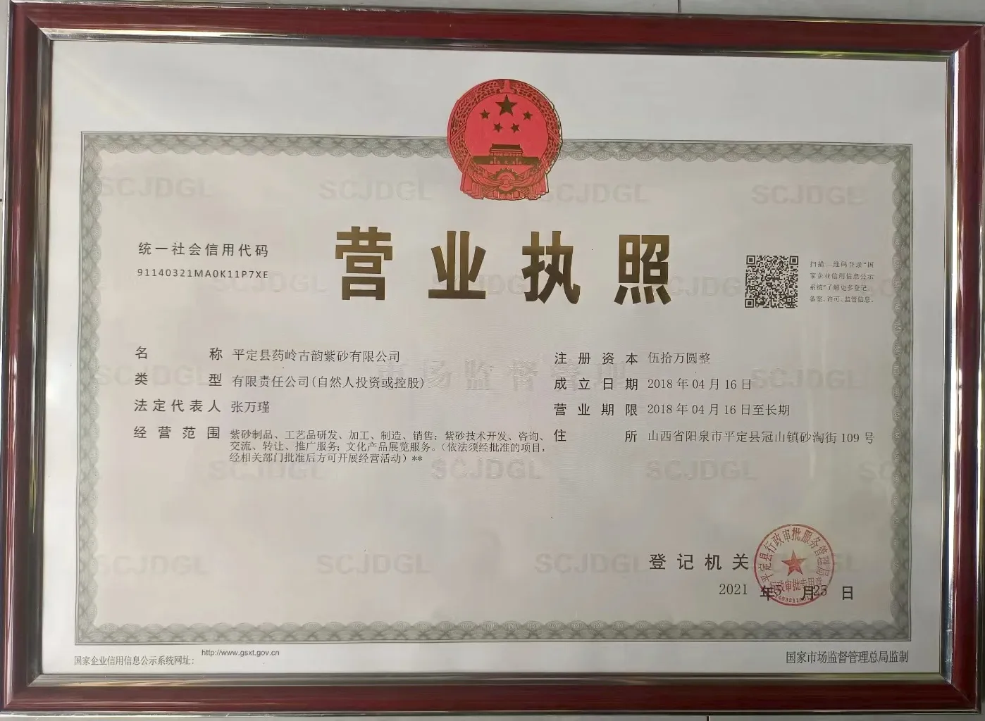 经营范围包含:紫砂制品、工艺品研发、加工、制造、销售;紫砂技术开发、咨询、交流、转让、推广服务;文化产品展览服务。